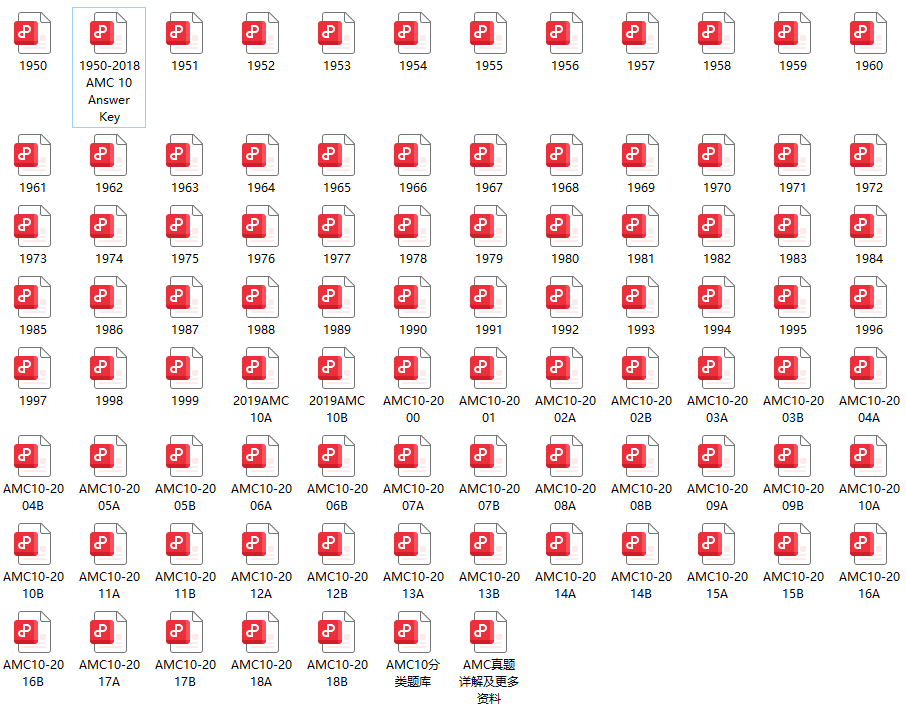 本页面包含AMC10历年真题及答案(内含视频解析)、【AoPS】2012-2020 AMC10 12难题选讲(全英版)、AMC10备赛书单、AMC10高频词汇、AMC10分类题库。