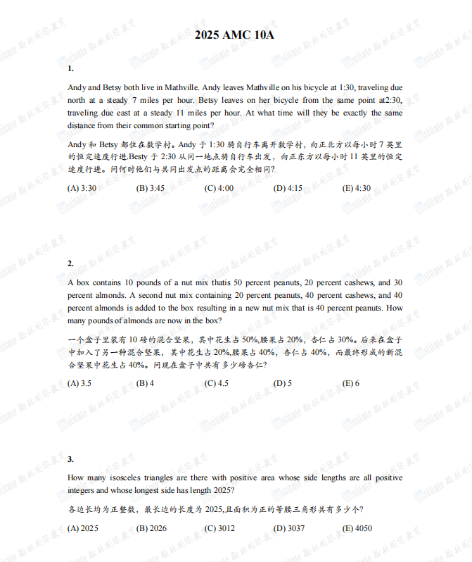 备战AMC10,刷真题是重中之重!这不仅能让你全面熟悉考点,更能通过沉浸式体验,精准把握考试节奏与难度,高效提升解题能力。AMC10面向10年级以下学生,核心考察代数、几何、数论、概率四大板块。为此,我们精心准备了配有中英双语解析的历年真题合集,高清可打印,助你备考事半功倍!